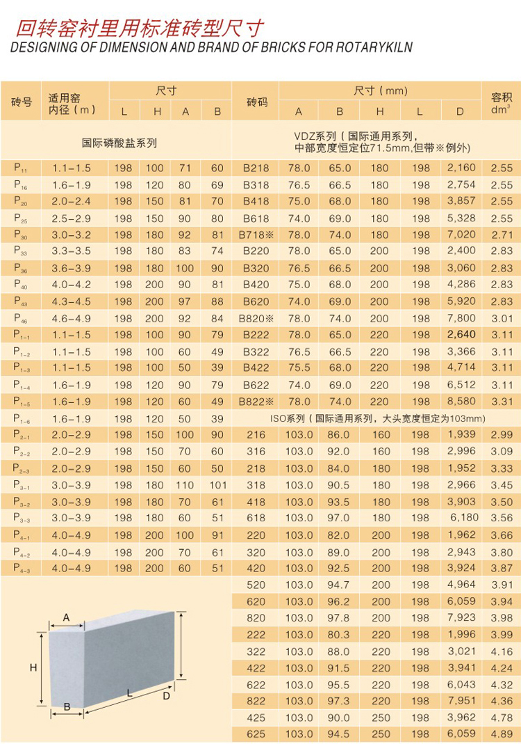 回轉(zhuǎn)窯襯里用標(biāo)準(zhǔn)磚型尺寸
