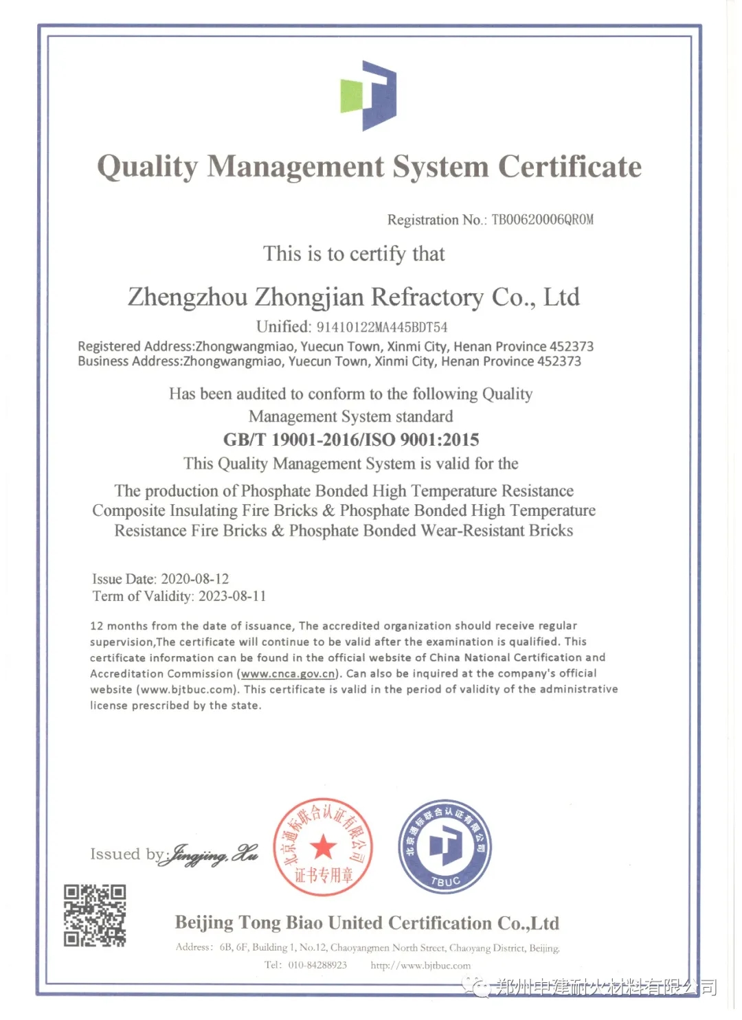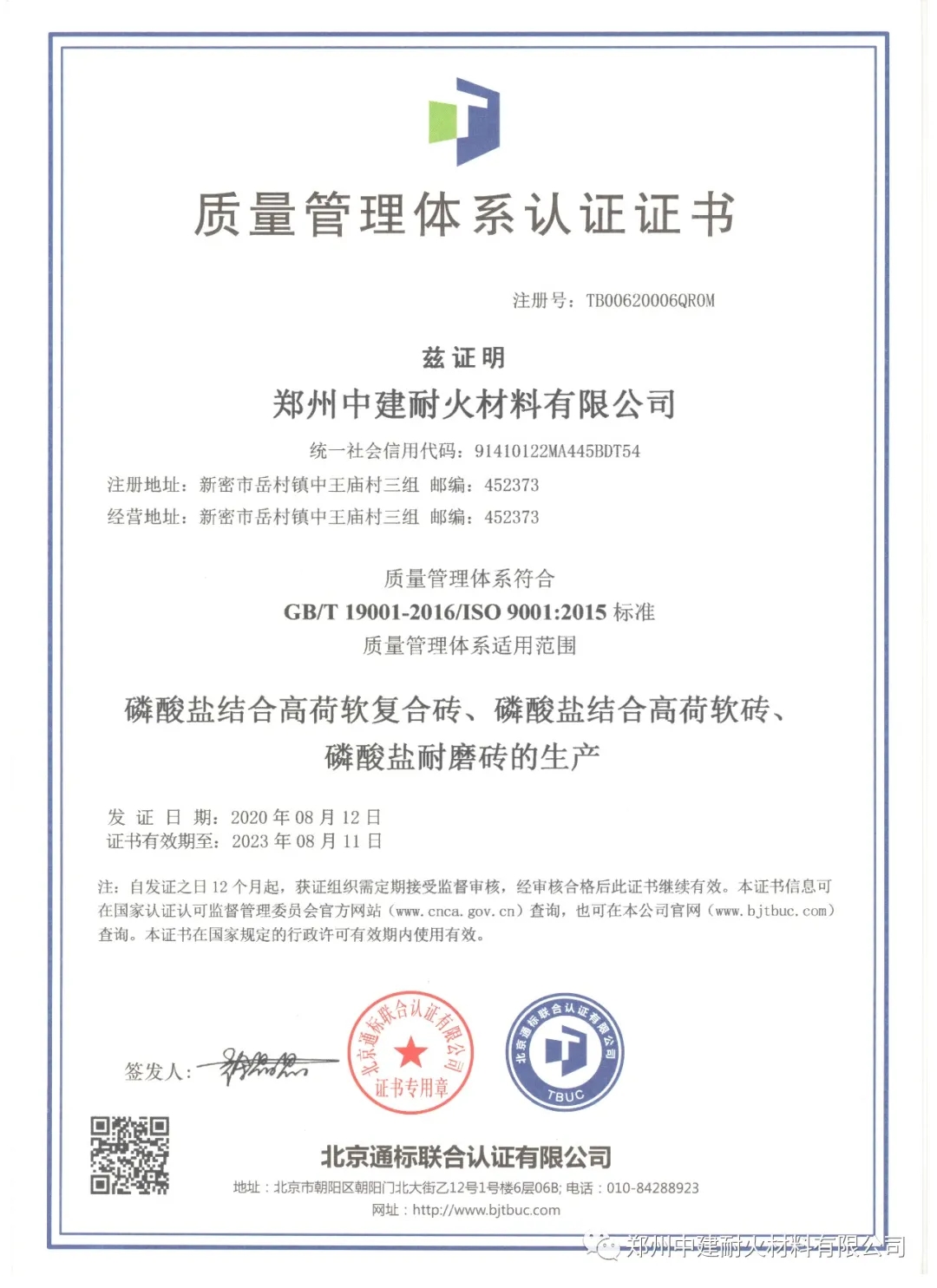 為提升公司整體競爭力,提高生產效率,形成標準化經營、規范化管理的模式,鄭州中建耐材從戰略的眼光出發,2020年初導入ISO9001質量管理體系。近日,鄭州中建耐材順利通過ISO9001:2015質量管理體系認證并獲得證書,認證范圍為“磷酸鹽結合高荷軟復合磚、磷酸鹽結合高荷軟磚、磷酸鹽耐磨磚的生產”。