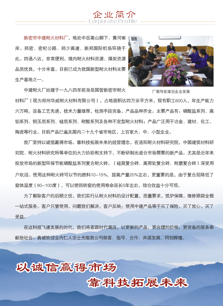 鄭州中建耐火材料有限公司管理團隊在董事長裴長松為代表的領導團隊每周舉行一次管理例會,對公司發展中出現的問題不斷的進行糾正,對公司的今后發展不斷的進行新的部署,保證中建公司能夠不斷的沿著正確的方向前進!
