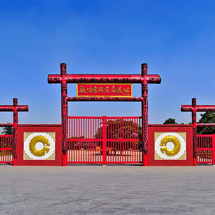 宮殿宗廟遺址位于河南省安陽市洹河南岸的小屯村、花園莊一帶,南北長1000米,東西寬650米,總面積71.5公頃,是商王處理政務和居住的場所,也是殷墟最重要的遺址和組成部分,包括宮殿、宗廟等建筑基址80余座。在宮殿宗廟遺址的西、南兩面,有一條人工挖掘而成防御濠溝,將宮殿宗廟環抱其中,起到類似宮城的作用。