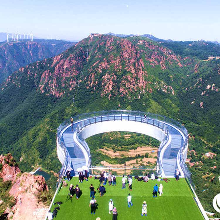 伏羲山紅石林玻璃環(huán)廊位橋面采用150塊三層鋼化夾膠玻璃鋪設(shè),距離峽谷地面360米,環(huán)廊伸出懸崖30米,比號稱“世界第八大奇跡”的美國科羅拉多大峽谷玻璃環(huán)廊還長出近9米。該橋采用無斜拉索設(shè)計,整體工程用鋼量超3000噸,被譽為“世界最長的高空玻璃環(huán)廊”,于2018年6月16日正式對廣大游客開放。